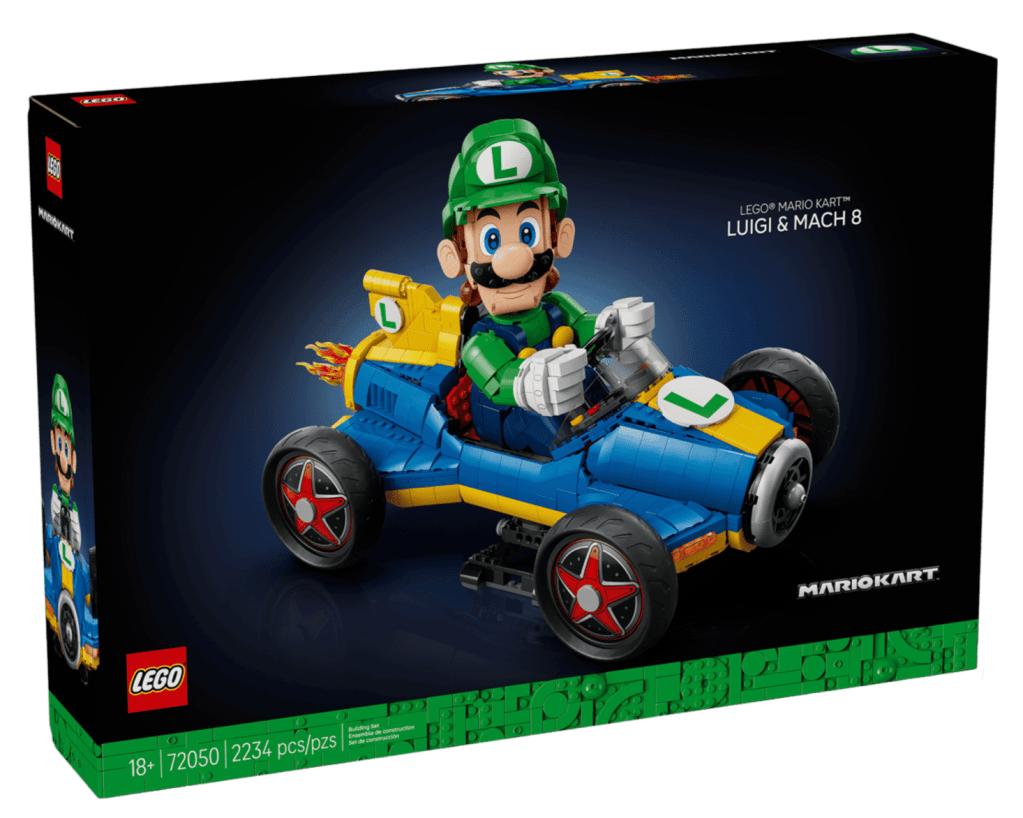 The new Luigi & Mach 8 set will come with 2,234 pieces – an increase of 272 over Mario Kart™ Mario & Standard Kart (#72037) that was released last May – and is priced at $179.99 (a modest increase of $10 over the Mario & Standard Kart set)